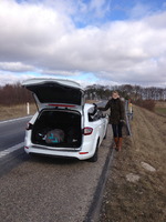 På vej tilbage til motorvejen kørte vi over noget og hørte en underlig lyd, 6-7 km længere fremme lød der et brag under bilen og kort tid efter måtte vi holde ind - den var god nok: Punktering... på motorvejen på vej til fest